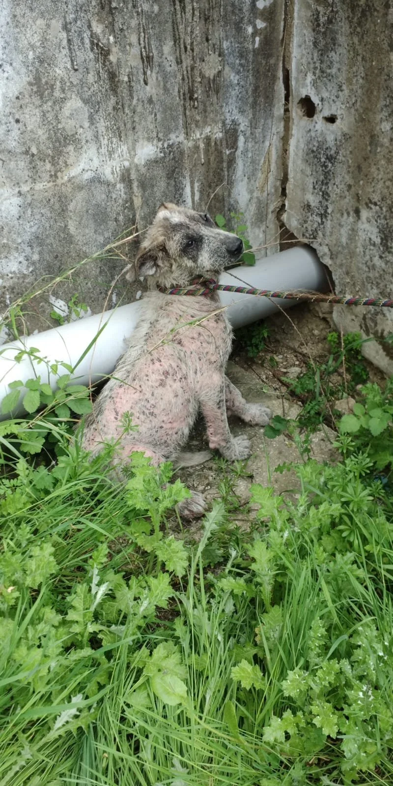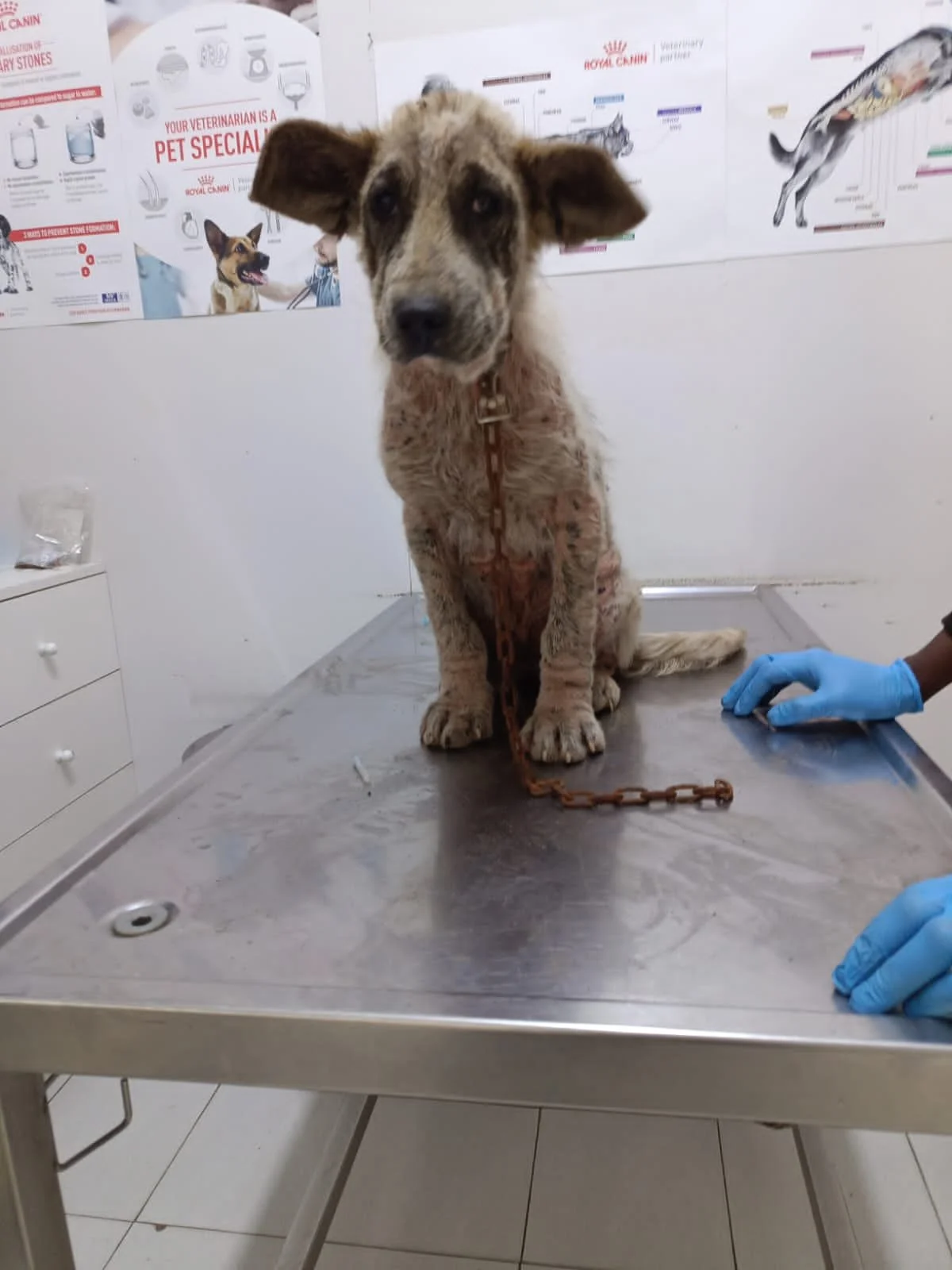 In early April 2023, our team was made aware of two young dogs who were living just behind a busy road. They had endured daily beatings from residents in the area, and had experienced the unimaginable horror of having hot car oil poured over them. Not only were their young bodies scolded, battered and bruised at the hands of humans, but they were also starving and suffering from an extreme case of mange.